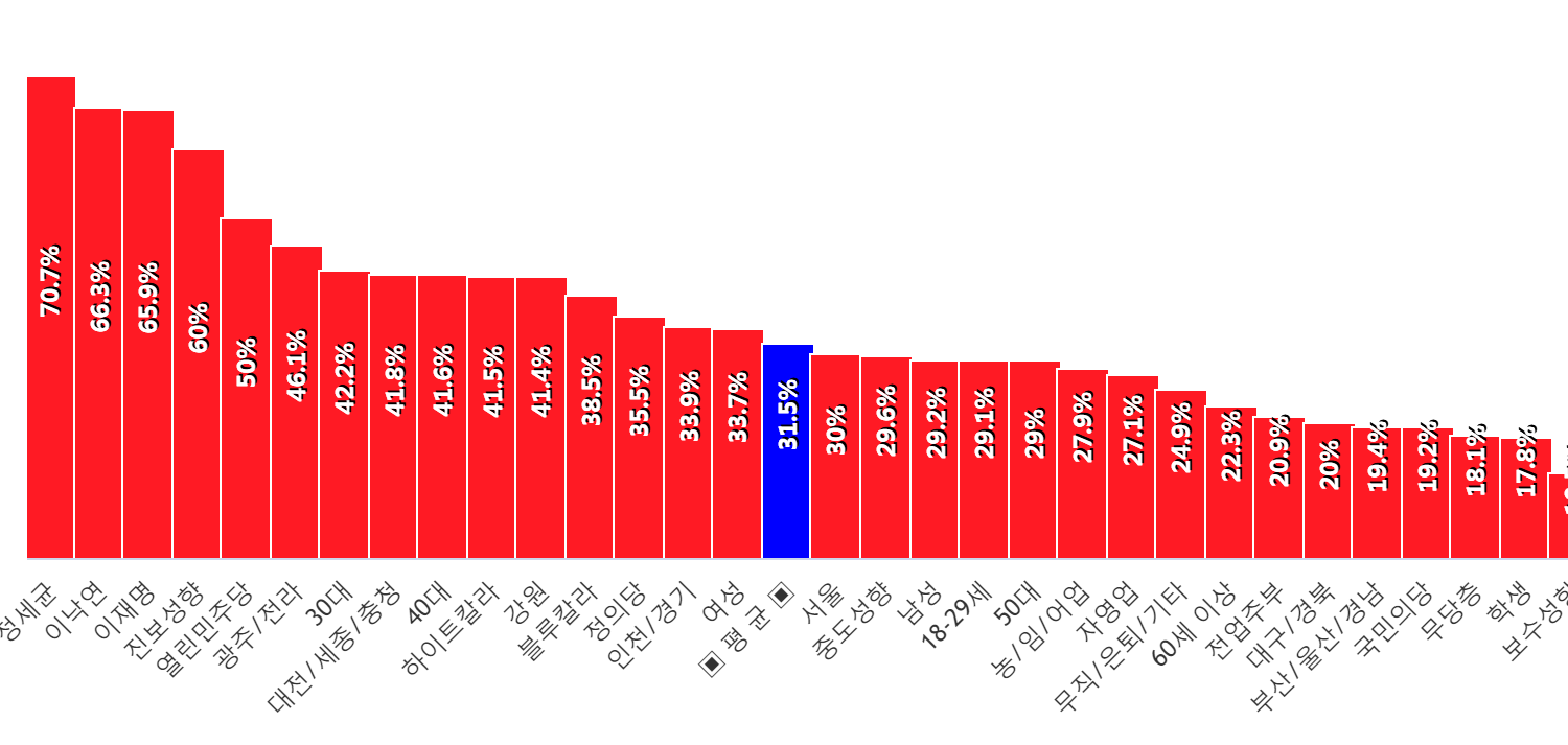 Á¤¼¼±Õ ÁöÁöÀÚ¿¡¼­ 71%·Î °¡Àå ³ô°Ô ³ªÅ¸³µÀ¸¸ç, µÚ¸¦ À̾î À̳«¿¬ ÁöÁöÀÚ(66%) ÀÌÀç¸í ÁöÁöÀÚ(66%) , Áøº¸¼ºÇâ(60%) ¿­¸°¹ÎÁÖ´ç(50%) ±¤ÁÖ/Àü¶ó(46%) 30´ë(42%) ´ëÀü/¼¼Á¾/ÃæÃ»(42%) 40´ë(42%) ÇÏÀÌÆ®Ä®¶ó(42%) °­¿ø(41%) µîÀÇ ¼øÀ¸·Î ±¹¹ÎÀÇÈûÀ» ±âÇÇÁ¤´çÀ¸·Î ²Å¾Ò´Ù.