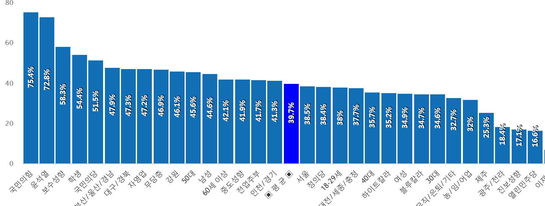 ±¹¹ÎÀÇÈû ÁöÁöÃþ¿¡¼­ 75%·Î °¡Àå ³ô°Ô ³ªÅ¸³µÀ¸¸ç, µÚ¸¦ À̾î À±¼®¿­ ÁöÁöÃþ 73%, º¸¼ö¼ºÇâ 58%, Çлý 54%, ±¹¹ÎÀÇ´ç 52%, ºÎ»ê/¿ï»ê/°æ³² 48%, ´ë±¸/°æºÏ 47%, ÀÚ¿µ¾÷ 47%, ¹«´çÃþ 47%, °­¿ø 46%, 50´ë 46%, ³²¼º 45%, 60¼¼ ÀÌ»ó 42%, Áßµµ¼ºÇâ 42%, Àü¾÷ÁֺΠ42%, ÀÎõ/°æ±â 41% µîÀÇ ¼øÀ¸·Î ´õºÒ¾î¹ÎÁÖ´çÀ» ±âÇÇÁ¤´çÀ¸·Î ²Å¾Ò´Ù.