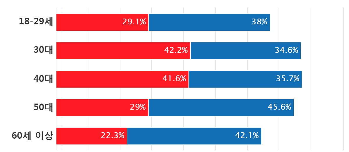 ¿¬·Éº°·Î "¹ÎÁÖ´çÀ» ÁöÁöÇÏÁö¾Ê°Ú´Ù"´Â ºñÈ£°¨ Á¤¼­°¡ ³ôÀº ¼ø¼­·Î, 50´ë(45.6%), 60¼¼ ÀÌ»ó(42.1%), 18-29¼¼(38%)·Î ³ªÅ¸³µÀ¸¸ç,