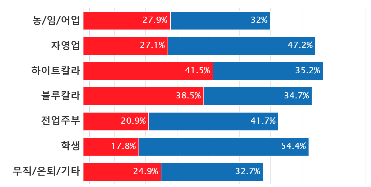 Á÷¾÷º°·Î´Â Çлý 54.4%, ÀÚ¿µ¾÷ÀÚ 47.2%·Î ¹ÎÁÖ´çÀ» Àý´ë ÁöÁöÇÏ°í ½ÍÁö ¾ÊÀ» Á¤´çÀ¸·Î ²Å¾ÒÀ¸¸ç, È­ÀÌÆ®Ä÷¯Ãþ 41.5%, ºí·çÄ÷¯Ãþ 38.5%´Â ±¹¹ÎÀÇÈûÀ» Àý´ë ÁöÁöÇÏ°í ½ÍÁö ¾ÊÀ» Á¤´çÀ¸·Î ²Å¾Ò´Ù.